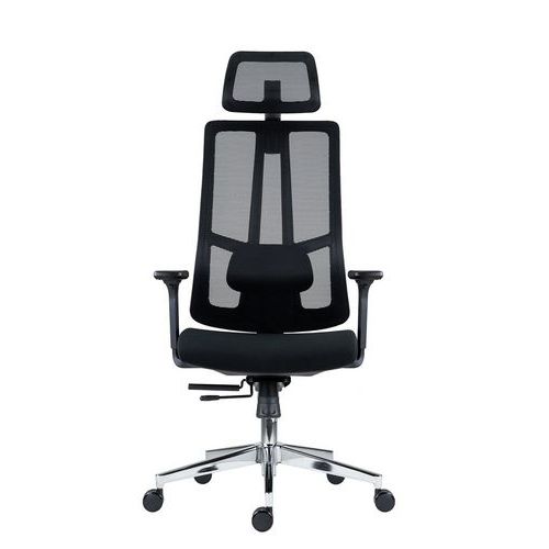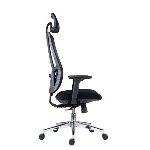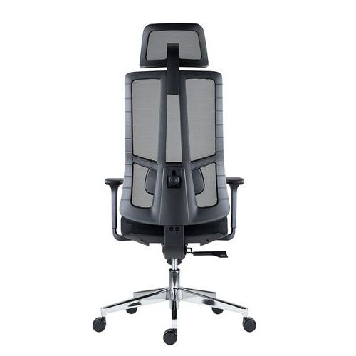 Kancelářská židle s vysokým polstrovaným opěradlem, které lze aretovat v přední i zadní poloze.