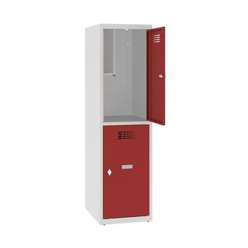 Svařovaná šatní skříň Acial, 2 oddíly, 300 mm, na nohách, otočný uzávěr, šedá/červená