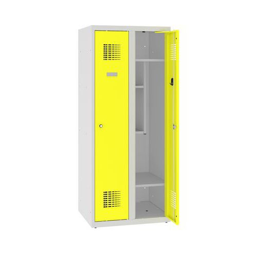 Snížená školní šatní skříň, 2 sloupce, 300 mm, šedá/žlutá, cylindrický zámek