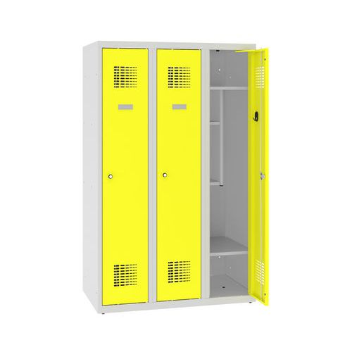 Snížená školní šatní skříň, 3 sloupce, 300 mm, šedá/žlutá, tříbodový cylindrický zámek