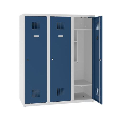 Třídveřové šatní skříně se sníženou výškou. Vhodné do škol pro žáky prvního stupně.